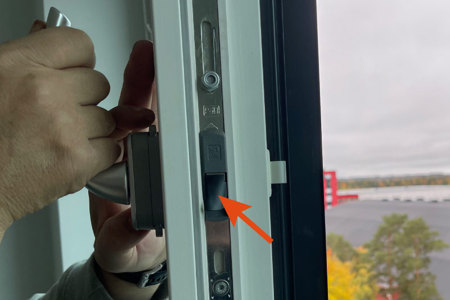 För att återställa fönsterbågen i sitt rätta läge gör du så här, det underlättar om ni är två personer som utför detta. 1. Med fönsterbågen fortfarande öppen, tryck fönsterbågens hörn på gångjärnssidan tillbaka på sin plats och håll det på plats där. 2. Tryck in den svarta knappen (markerad i bilden nedan) och lirka handtaget så att handtaget släpper från sitt läge 3. Ställ handtaget i vädringsläget (horisontellt) 4. Stäng